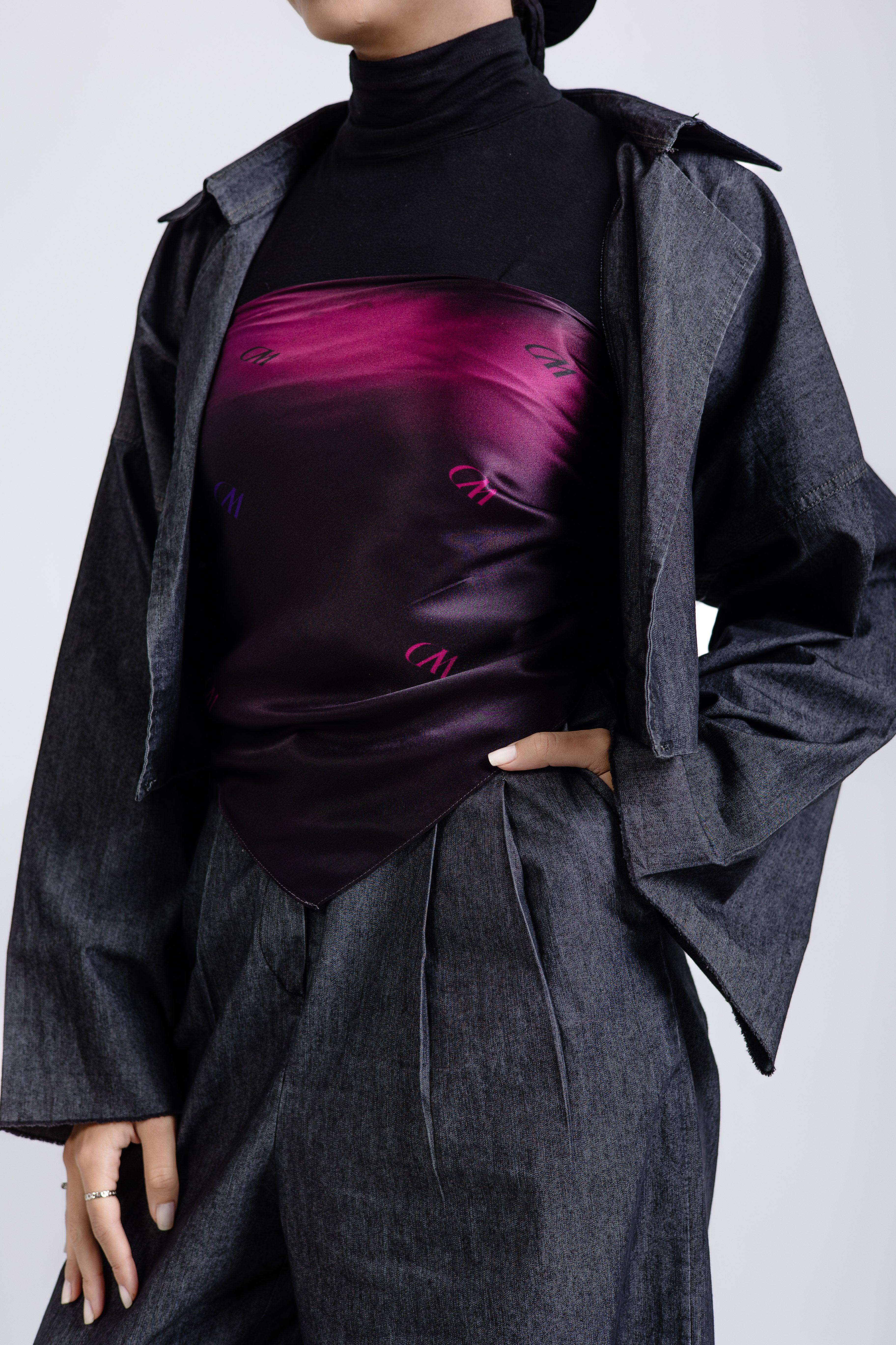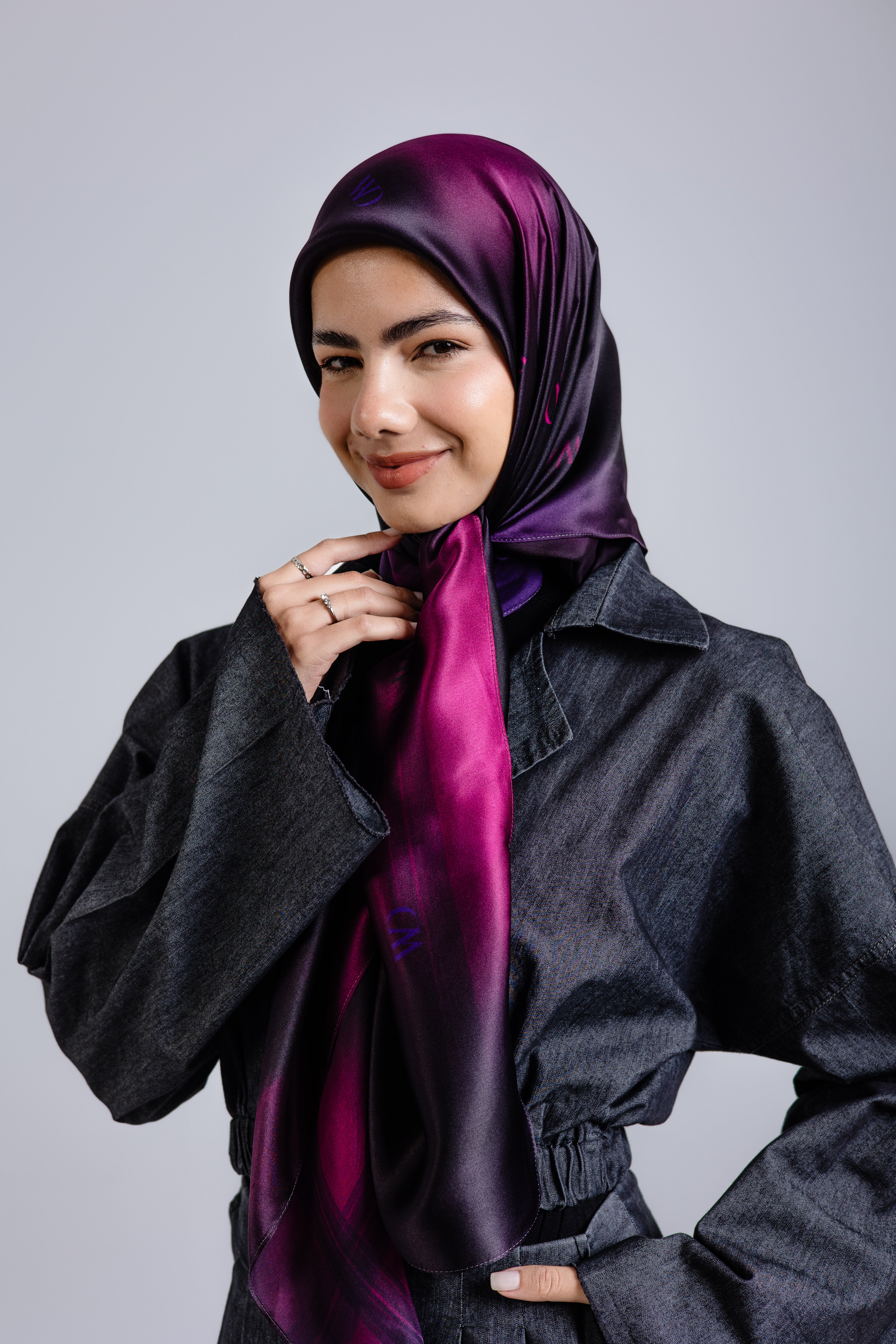 From Worood’s colorful silk scarf collection, this soft touch silk scarf in authentic silk fabric blends mulberry and black in a bold, passionate ombré.